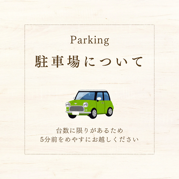 また、駐車場に限りがございますので5分前をめやすにお越しくださるようご協力をお願いいたします。
