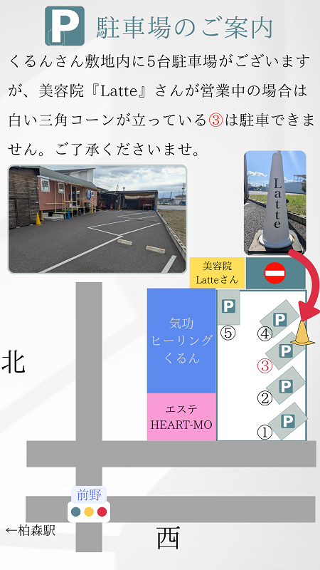 くるんさん敷地内に駐車場が5台ございますが、美容院『Latte』さんが営業中の場合は白いコーンが立っている前から③番目は駐車できませんのでご了承くださいませ。