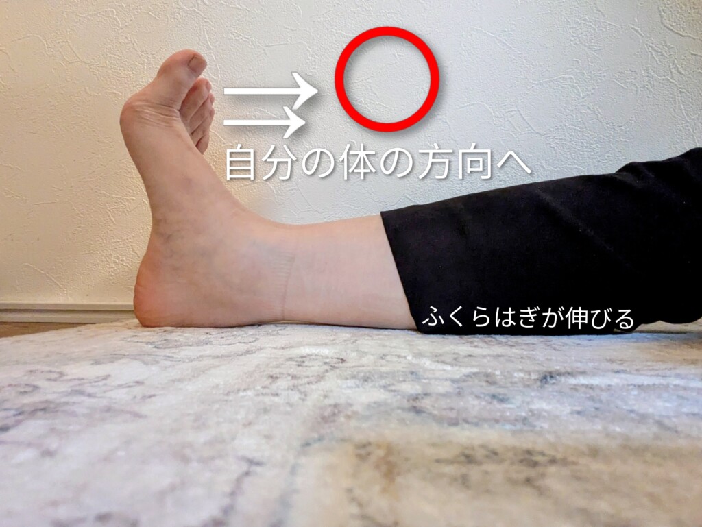 もしふくらはぎがつりそうになったときの対処として、足を伸ばしてつま先を自分の体の方向へ引き寄せるようにし、ふくらはぎの筋肉を伸ばすようにすると効果的です。