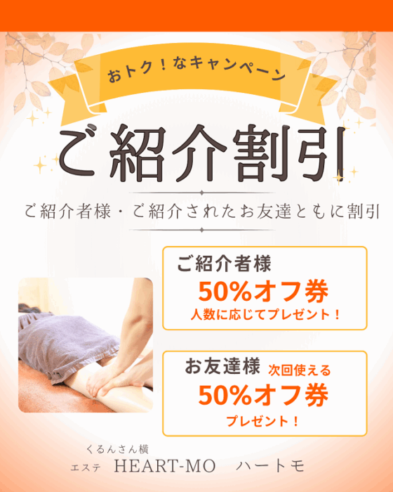 ご紹介割引として、紹介した方も・された方も『次回30分以上のコースでお使いいただける50%オフ券』をお渡ししております。(※有効期限はお渡しした日から3か月以内となります)