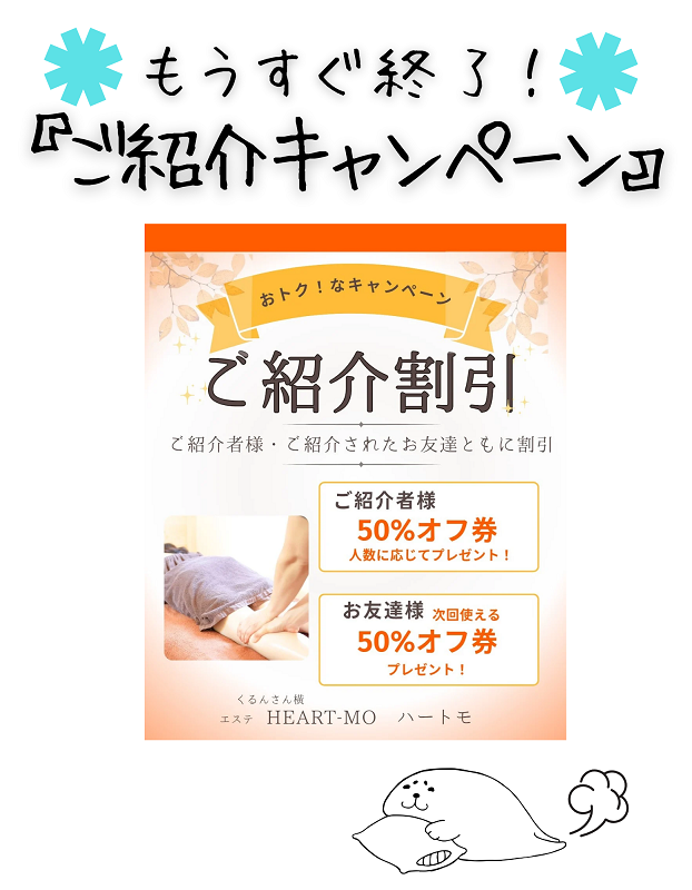 愛知県江南市の女性限定エステ【HEART-MO ハートモ】は、今月末で『ご紹介キャンペーン』が終了する予定です。