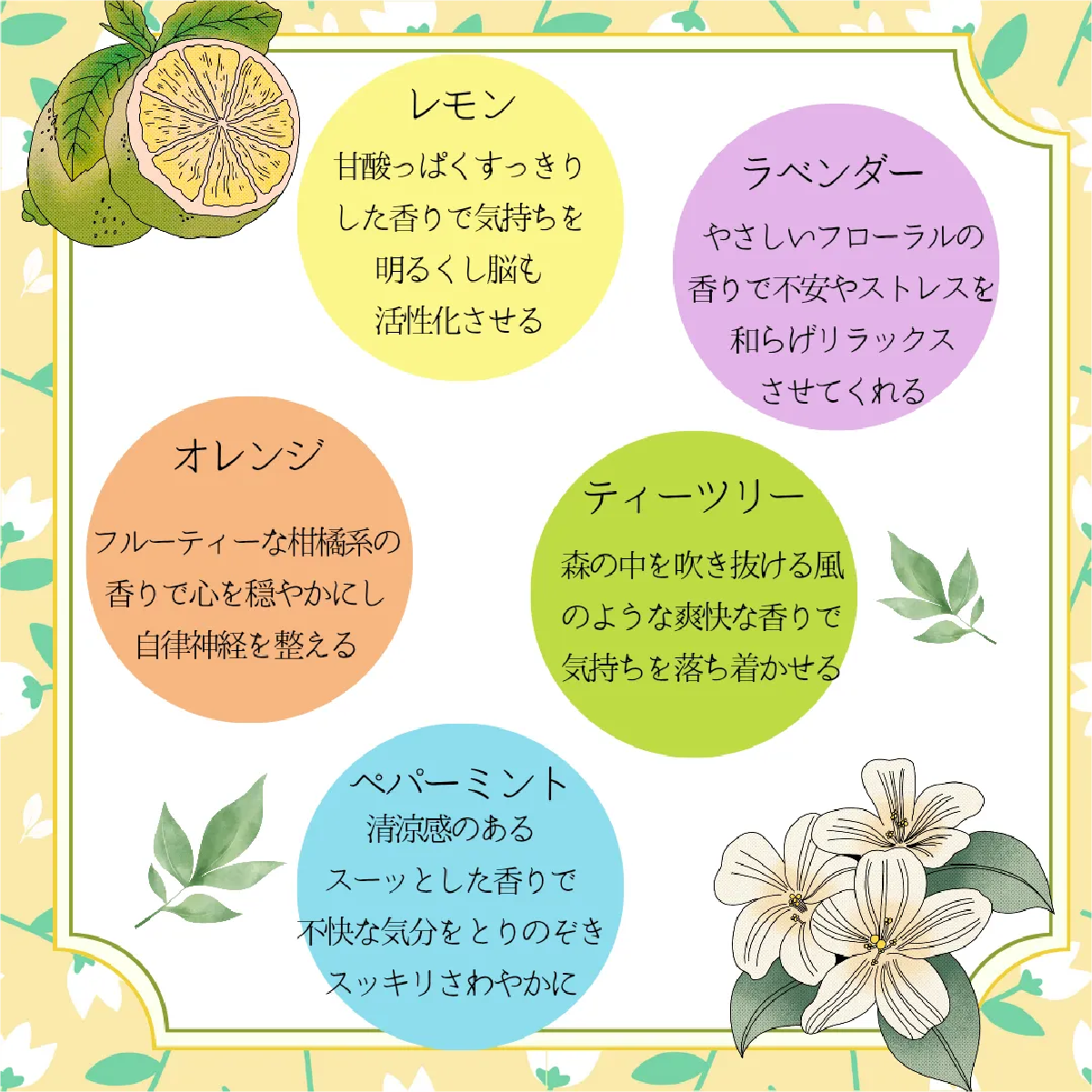 〈オレンジ〉フルーティーな柑橘系の香りで心を穏やかにし、自律神経を整えます。